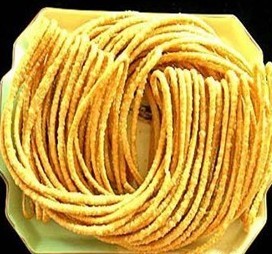 團馓俗稱“糯米馓子”,是苗族、土家族、白族和漢族都愛吃的一種土特產。是將地道的土家糯米蒸熟,倒入一種由特制的木板做底,圍篾做圓圈的模子內,將熟糯米壓平并用一種農家栽種的紫果水或食色素在上面畫“喜”字等吉祥圖案,等冷卻后取出來,曬干、儲藏。逢年過節時送親友或是招待貴客,吃時用食物油炸酥,膨脹后比原來的面積大2~3倍,味道香脆可口。