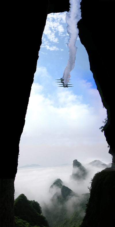 2006年3月,俄羅斯空軍“勇士”特技飛行表演隊,駕駛蘇27重型戰斗機飛臨天門山,欲完成一次不可思議的特技飛行表演,想創造出重型戰斗機穿越天門的挑戰奇跡。盡管因巨大的風險和輿論壓力最終放棄“穿越天門”的挑戰,但俄羅斯空軍在天門山上空進行的精彩飛行表演仍然令人震撼。