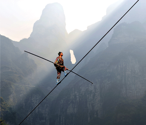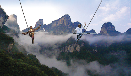 2008年10月,新疆達瓦孜絕技第七代傳人賽買提·艾山在天門山進行了空前難度的極限坡度高空走鋼絲行走挑戰。鋼絲架設在天門山奇峰絕嶺間,長700米,傾斜度達39°。此次挑戰的難度之大超乎想象,被眾人視為不可能完成的任務。賽買提最終功虧一簣,在離終點約60米處跌倒,但其勇氣和絕技令眾人折服。2009年4月,賽買提英雄歸來,再次挑戰這條鋼繩并終于成功,在天門山創造出世界高空鋼絲行走最具難度和風險的一次極限征服。
