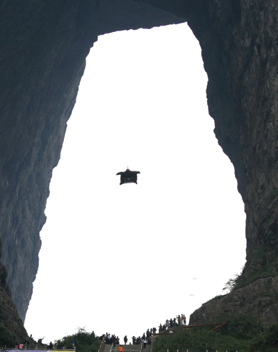 2011年9月24日,“2011翼裝飛行穿越天門”極限挑戰活動在天門山震撼上演。來自美國、意大利、芬蘭等6個國家的9名翼裝飛行高手分別以天門山索道轎廂、山頂懸崖為起跳點,進行了精彩絕倫的翼裝飛行表演。當天,全球最頂尖的“翼裝飛俠”,來自美國的杰布・科里斯還成功挑戰人類首次無動力翼裝飛行穿越天門洞。1999,世界特技飛行大師駕機穿越天門,實現了人類首次駕機穿越自然山洞的奇跡。2011,“穿越天門”挑戰12年后再次呈現,舉世震撼!