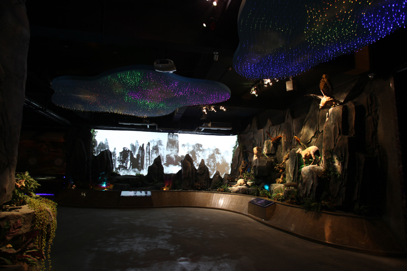 展廳右側為一幅張家界全景水墨長卷,以多媒體投影的云霧輔助全景畫的形式為游客描繪了一幅奇峰競秀、奇花爭妍、云煙繚繞、溪水潺潺、珍禽競翔、鳥啼蟬鳴的張家界。畫里的山石自然延伸到了畫外,一些珍禽異獸的標本從巖石的縫隙中探出身來,在燈光的襯托下既靈動、神秘又切合主題。